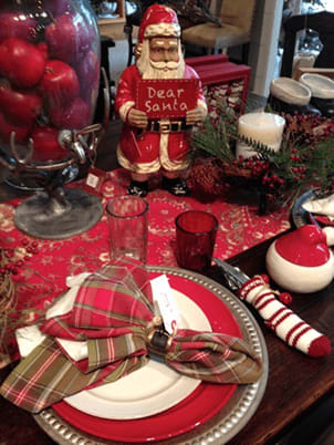 Completing the Christmas red theme are apples, holly berries, a vintage Santa figurine and a bright table runner. I love the silverware tucked into a miniature knitted holiday stocking. This table works for children and adults. Bravo, Pottery Barn.