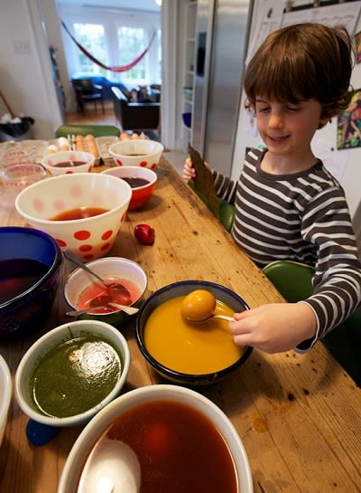 Or you can talk to John Musnicki, the East Hampton-based graphic artist and product designer, who is the force behind the annual Lions Club Pumpkin Carving Contest (see some of the awe-inspiring entries here) and a master egg dyer. Musnicki and his family dye several dozen eggs in anticipation of the annual Easter egg hunt with friends and family. He shares a few of his tips below: