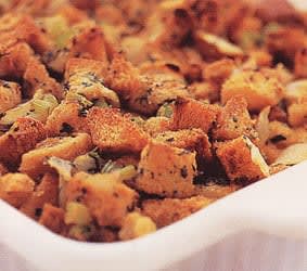 The good news is that there’s a variety of stuffing options out there—both for the cook looking for to stay close to tradition and the cook who wants to branch out and try something different. Truly, the possibilities are endless. Why not try a Southwestern stuffing that’s filled with jalapeños and tamales and corn? (You can serve it with corn ships, salsa and sour cream and have it do double-duty as a side dish.) Or—yum—sourdough stuffing with balsamic-roasted red onions, sweet Italian sausage and sage? For another Southern twist, you could do bread stuffing with crawfish, bacon and collard greens. Or, if you want to stay traditional, how about a classic farmhouse herbed stuffing flavored with sage, rosemary and thyme?
